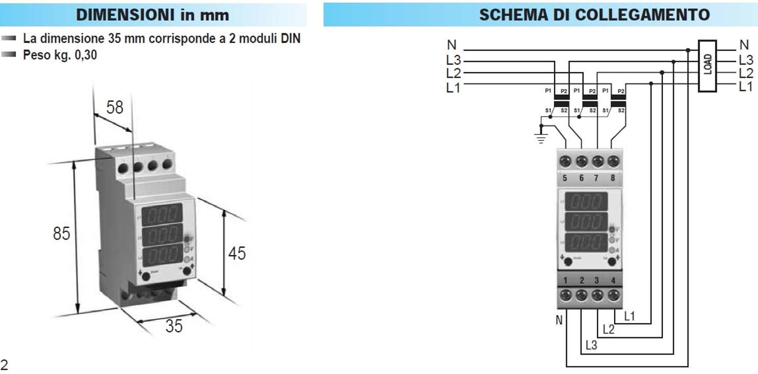 Multimetro trifase digitale con visualizzazione a LED 3 digit su 2 linee 2 DIN