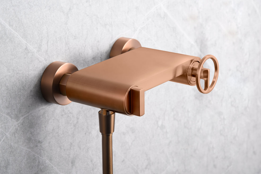 IMEX Set doccia monocomando oro rosa spazzolato in ottone con doccetta rotonda tubo flessibile 180 cm in acciaio rinforzato supporto ABS cartuccia ceramica Ø35 mm modello Imex-BDC033-5ORC