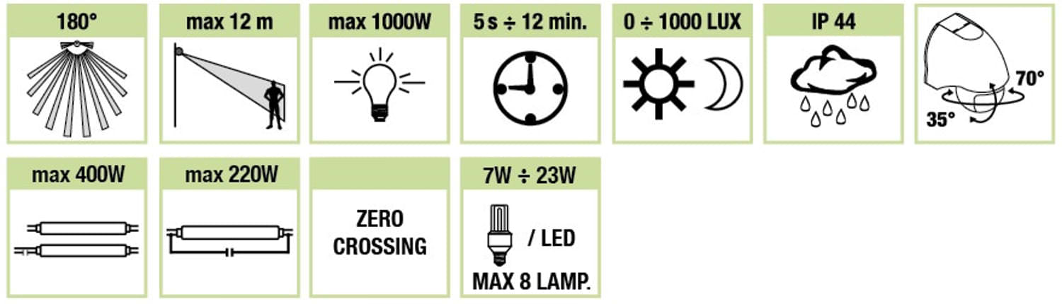 inibisce l’accensione dell’illuminazione in funzione della luminosità ambientale. I rilevatori trovano applicazione per l’accensione delle luci di: corridoi privati e pubblici, autorimesse, viali di accesso e in ingressi delle abitazioni, porticati, scalinate, corridoi, bagni ecc.